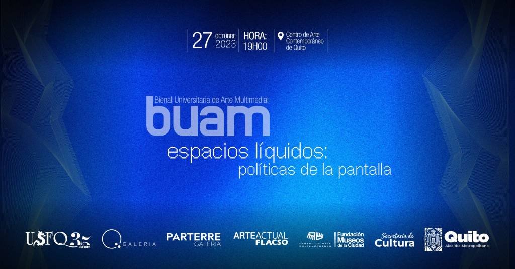 Quito, DM (26/10/2023). La Fundación Museos de la Ciudad, a través del Centro de Arte Contemporáneo y la Universidad San Francisco de Quito, en colaboración con Galería Parterre de la Pontificia Universidad Católica del Ecuador, Arte Actual FLACSO y Q Galería (USFQ), se enorgullecen en presentar la inauguración de la exposición: Bienal Universitaria de Arte Multimedial (BUAM) – Espacios Líquidos: Políticas de la pantalla.